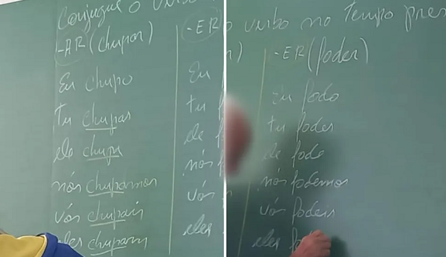Um pai de um aluno, que preferiu não se identificar, relatou ao portal g1 que seu filho tirou fotos da lousa e enviou a ele. Nas imagens, é possível ver o professor conjugando esses verbos.