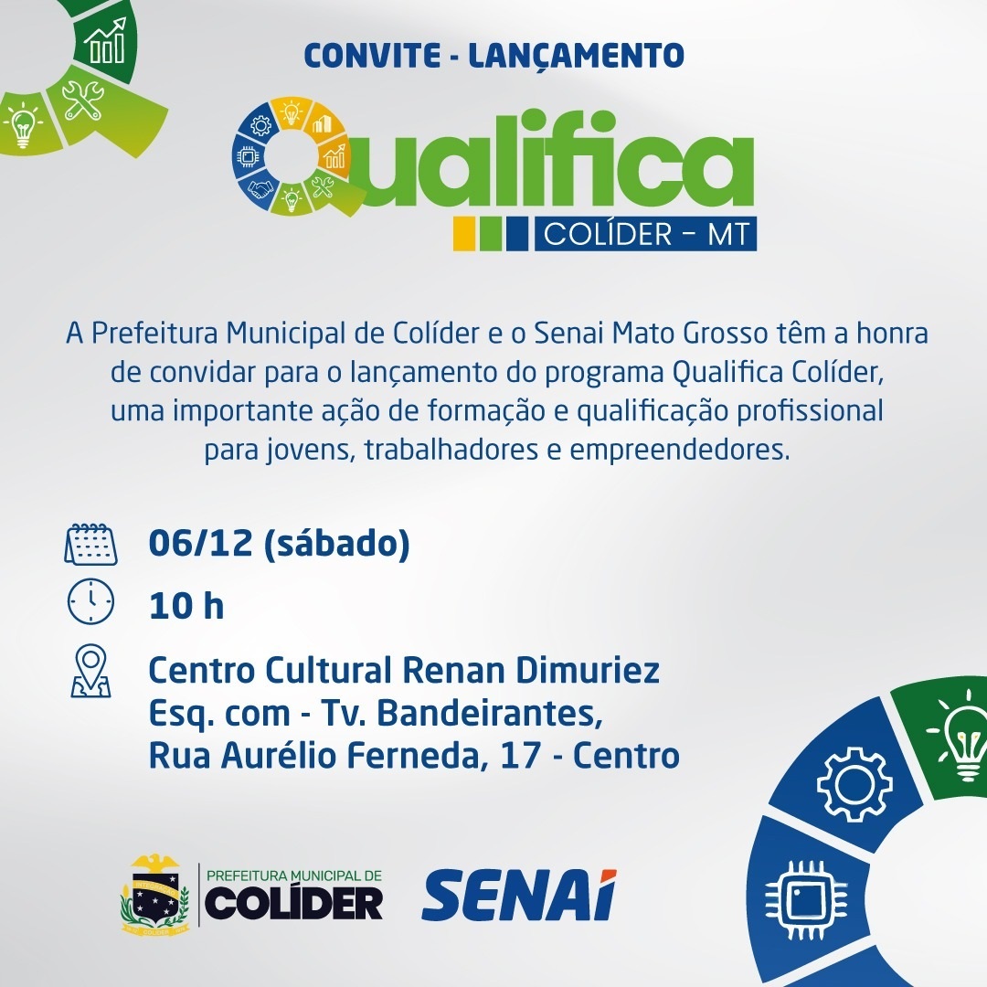 A Prefeitura Municipal de Colíder, em parceria com o Senai Mato Grosso, realizará neste sábado (06/12), às 10h, o lançamento oficial do Qualifica Colíder, um dos maiores programas municipais de formação profissional já estruturados para atender jovens, trabalhadores e empreendedores do município.