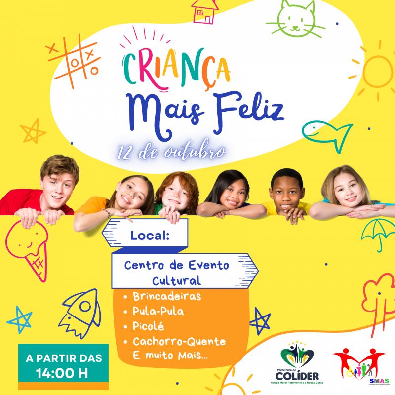 Para comemorar o Dia das Crianças, a Prefeitura de Colíder, por meio da Secretaria Municipal de Assistência Social e com o apoio de empresas e instituições, está organizando uma grande programação. A segunda edição da festa “Criança Mais Feliz” será realizada no dia 12 de outubro, a partir das 14h até às 17h30min no Centro de Eventos de Colíder.