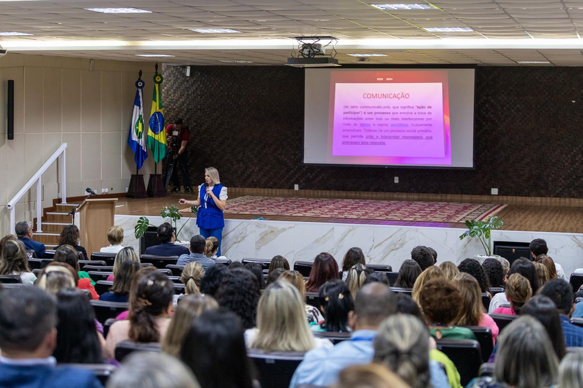 #Paratodosverem. Esta matéria possui recursos de texto alternativo para promover a inclusão das pessoas com deficiência visual. Primeira imagem: Assessora Katiane Boschetti a frente do palco durante a palestra. Segunda imagem: Desembargadora Clarice Claudino faz uso da fala. Terceira imagem: Diretora-geral do Tribunal de Justiça, Euzeni Paiva de Paula concede entrevista à TV.Jus.