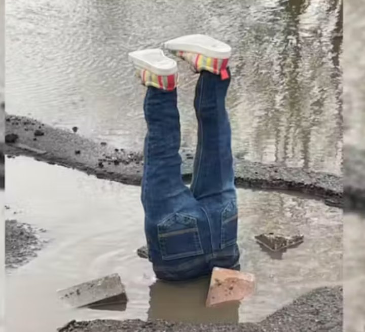 Esse homem não aguentava mais desviar de um buraco imenso na rua, durante 8 meses, e fez um protesto irreverente: ele colocou pernas falsas de cabeça para baixo no buraco aberto numa avenida. O resultado? As autoridades resolveram o caso em quatro dias!