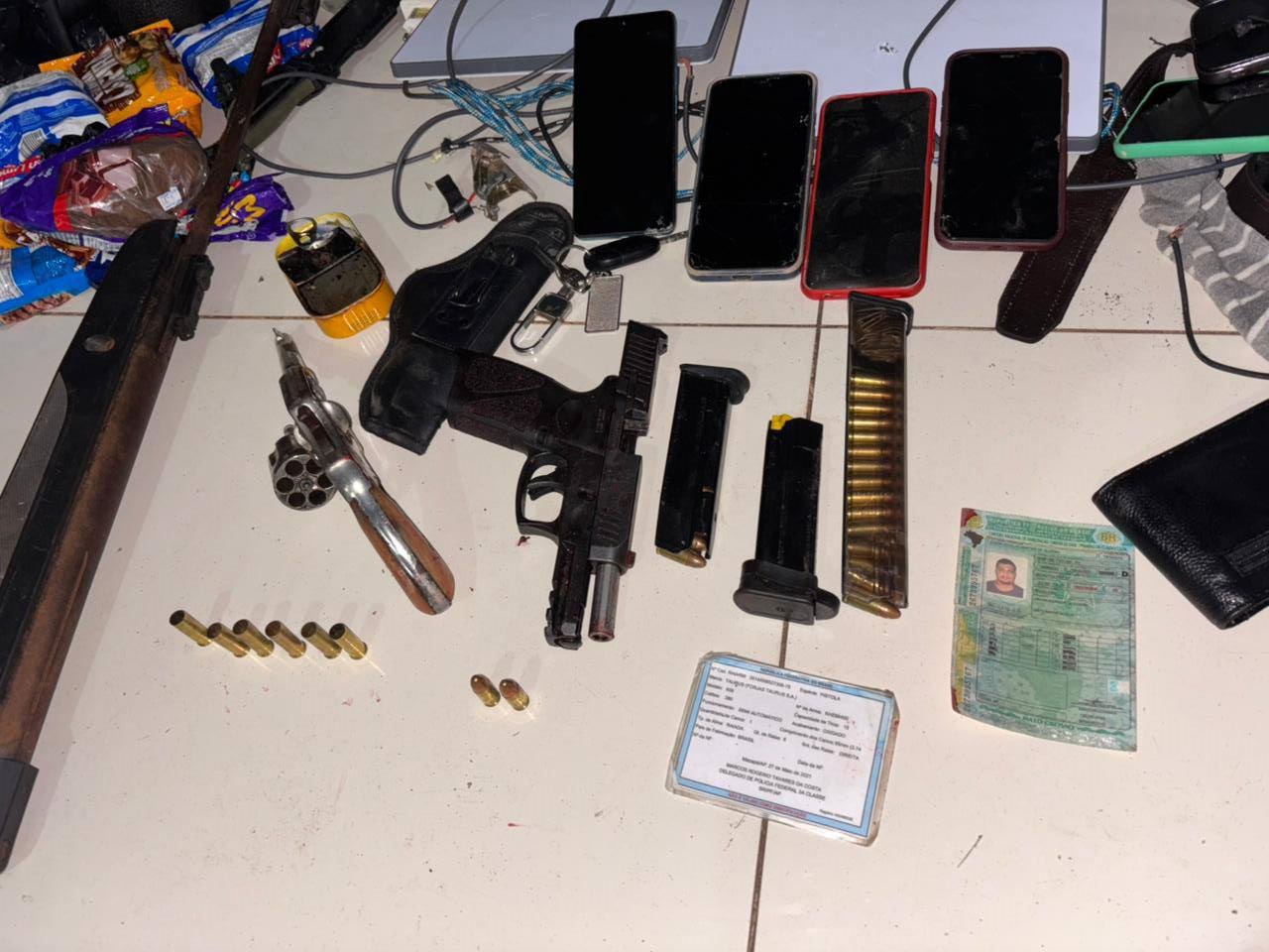 Entre os materiais apreendidos estavam: revólver calibre .38, pistola 9mm, espingarda calibre .22, carregadores, munições e celulares — dois deles pertencentes às vítimas do assalto. A ocorrência foi registrada para as devidas providências legais.