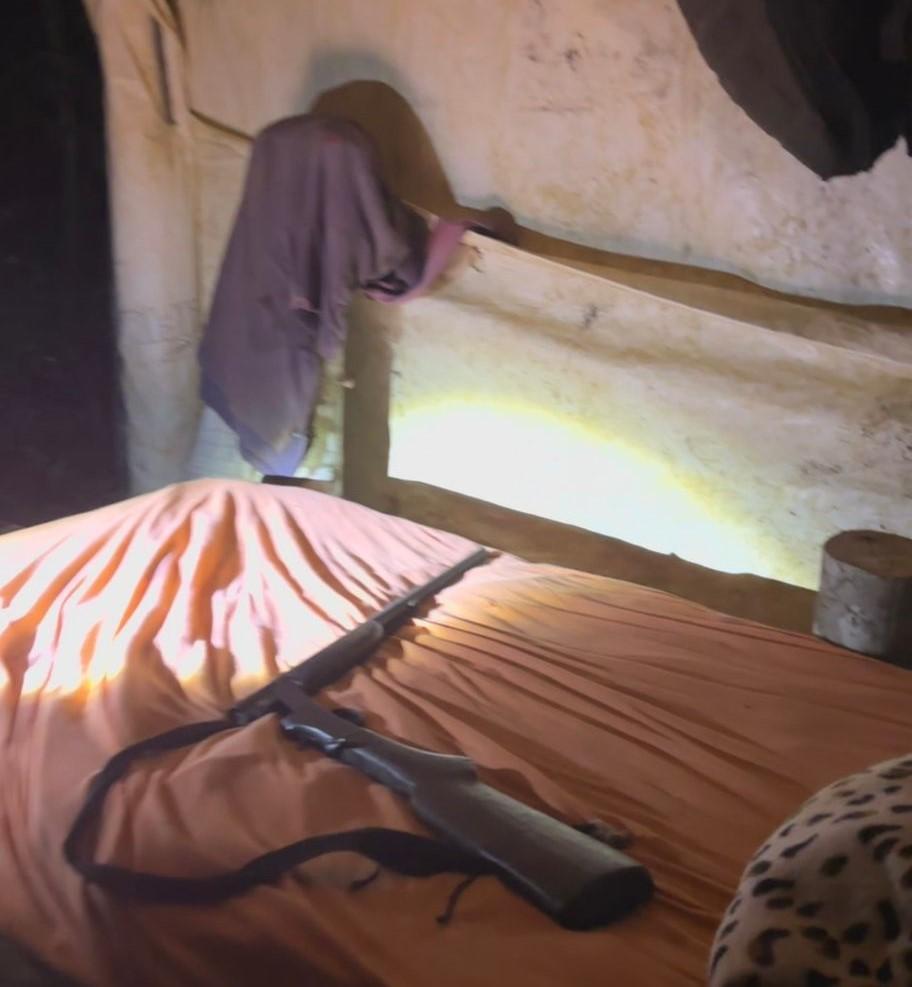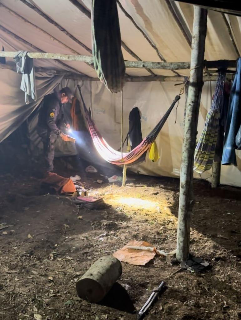 No local, havia dois barracos, camas e redes, um fogão de madeira e tijolos, entre outras estruturas improvisadas, conforme o relatório e imagens feitas pelos policiais. A arma apreendida, uma espingarda calibre 24, acompanhada de com 9 munições, foi encontrada sobre a cama de um dos barracos.