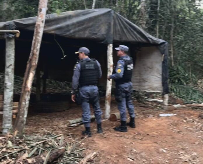 Os policiais constataram, entre outros possíveis crimes, o desmatamento de uma trilha de cerca de 3 km para chegar até a margem de um córrego, ponto onde ocorria a retirada ilegal de madeira e a instalação de moradias improvisadas.