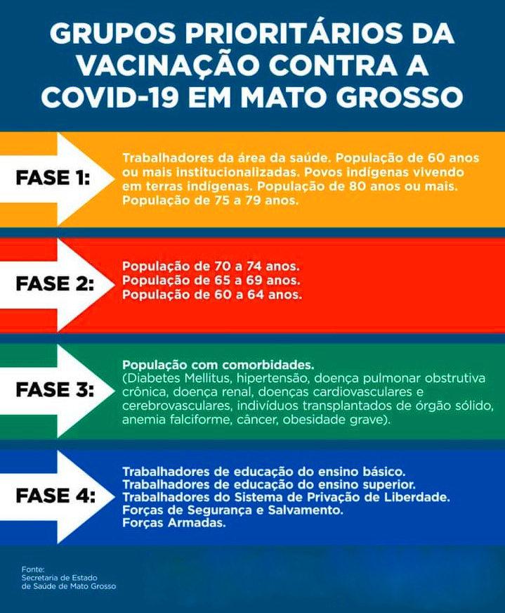 Conforme o plano de vacinação contra a Covid-19 definido pelo pGoverno Federal, a vacinação será  dividida em quatro fases. Cada fase vai imunizar um determinado tipo de público definido com base no risco de evolução para quadros mais delicados da doença, da exposição ao vírus ao desenvolvimento. Plano Nacional de Operacionalização da Vacinação