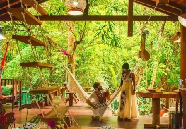 A casa da árvore é uma hospedagem única que se integra com a floresta amazônica, oferecendo redes, camas e balanços em um ambiente encantador. A casa está localizada em Alter do Chão e acomoda até 8 hóspedes, com uma nota de 4,96 no Airbnb.