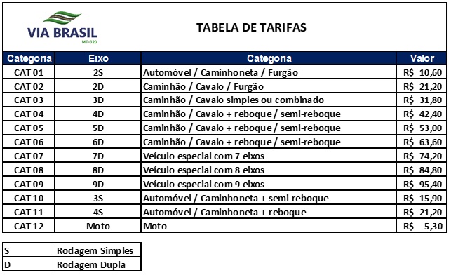 A partir da zero hora (00h) desta sexta-feira (03/11/2023) entra em vigor o reajuste contratual anual da tarifa de pedágio dos trechos concessionados das rodovias estaduais MT320 e MT208. O valor da tarifa básica passa dos atuais R$ 10,10 para R$ 10,60.