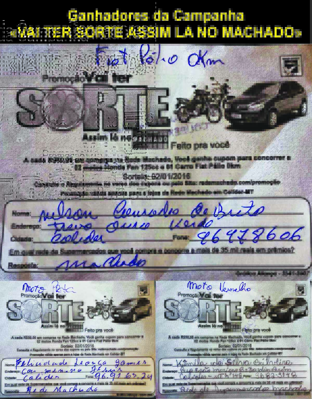 promoção 2                      Moto Preta – Felicidade Leonço Gomes, Comunidade Bom Jesus, Colider. E o grande felizardo que levou o carro Fiat Pálio foi Nelson C. de Brito, Comunidade Trevo Ouro Verde, Colider.promoção 01