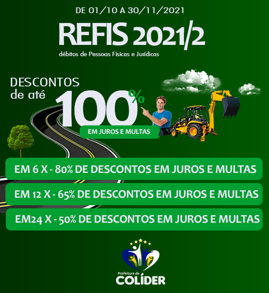 A prefeitura de Colíder oferece mais uma chance aos munícipes inadimplentes quitarem seus débitos em dívida ativa, através do programa Refis. Podem ser negociadas as dívidas de IPTU, contribuição de melhorias, entre outras, vencidas até 2020.