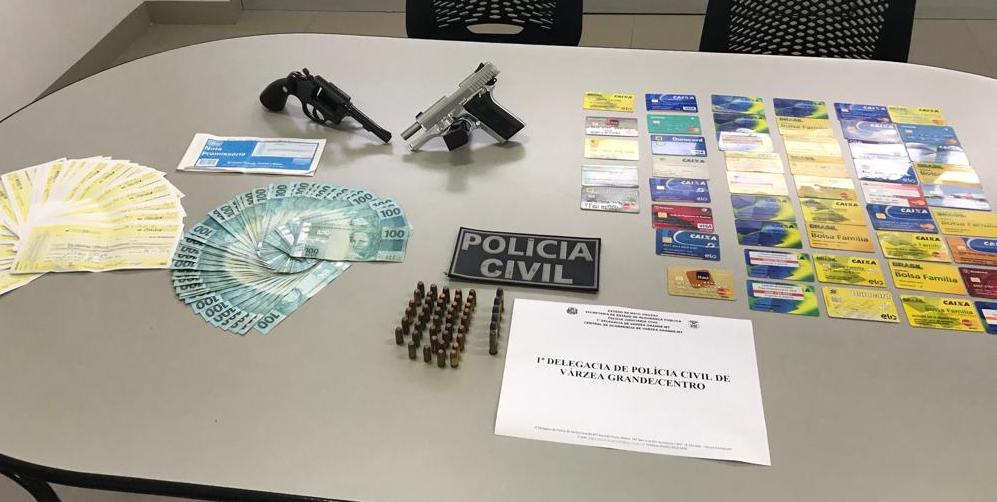 Uma investigação para apurar crimes de agiotagem e posse ilegal de arma de fogo, conduzida pela Polícia Judiciária Civil, através da 1ª Delegacia de Polícia de Várzea Grande (1ªDP-VG), resultou na apreensão de duas armas de fogo, munições, além de mais de R$ 5 mil em dinheiro, notas promissórias e diversos cartões do Programa Social Bolsa Família.
