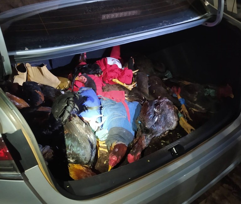 Ao dar ordem de parada ao veículo, foram encontrados 22 galos característicos aos utilizados em “rinhas”, transportados dentro de sacolas de pano, 12 estavam no porta-malas e 10 estavam entre os bancos na parte de trás e frente do veículo, todos amarrados e com as cabeças ensacadas, sem alimentação e ventilação.