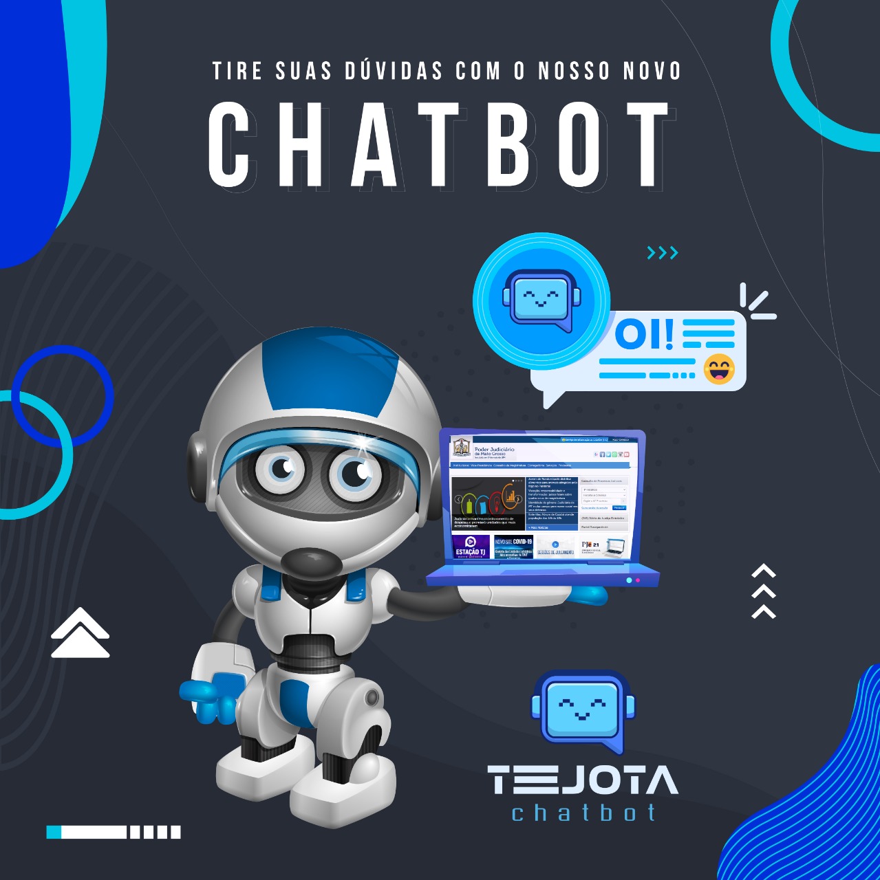 Desde as primeiras horas desta sexta-feira (27/11), todo cidadão passou a contar com um importante aliado na hora de acessar informações sobre os serviços prestados pelo Poder Judiciário de Mato Grosso. Trata-se do Tejota, um nome simpático para um robô que responde de maneira rápida e precisa as principais dúvidas dos usuários, 24 horas por dia, sete dias por semana, e que foi originalmente batizado como Tecnologia Judicial Otimizada para Atendimento.As informações armazenadas pelo robô foram prestadas pelas Coordenadorias do Tribunal de Justiça e tratam dos mais diversos assuntos: trâmite processual, emissão de certidão, PJe, documentos, processos seletivos, tudo respondido em forma de simulação de um diálogo. O serviço está disponível no Portal do TJMT, ao final da página, do lado direito da tela.