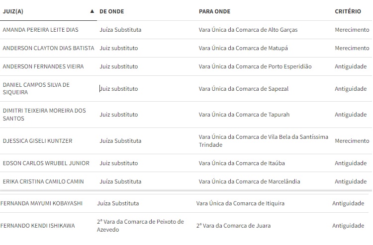 Da lista, o único que já estava lotado como titular era o juiz Fernando Kendi Ishikawa. O magistrado estava na 2ª Vara de Peixoto de Azevedo e foi promovido por antiguidade para a 2ª Vara de Juara.