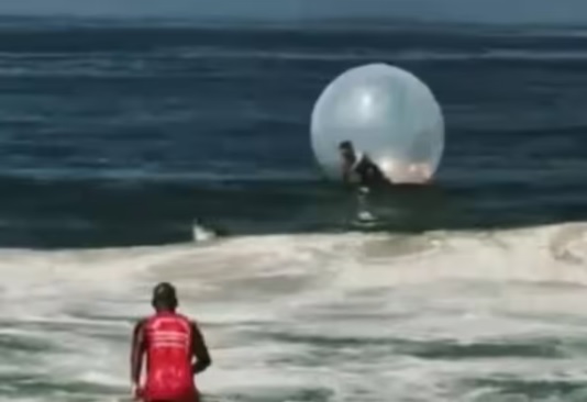 O operador da bolha inflável em Copacabana não sabia nadar muito bem e acabou perdendo o controle do brinquedo. – Foto: Reprodução/Twitter
