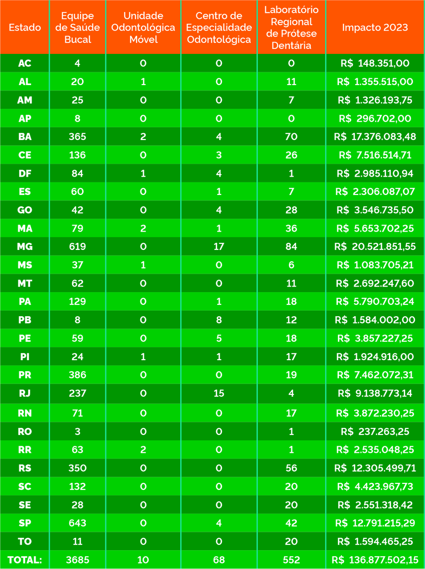 A primeira medida adotada pelo Ministério da Saúde para o fortalecimento do Brasil Sorridente é a ampliação do atendimento com o credenciamento de 3.685 novas equipes de saúde bucal e 630 novos serviços e unidades de atendimento. O investimento nessas novas habilitações soma R$ 136,87 milhões em 2023.