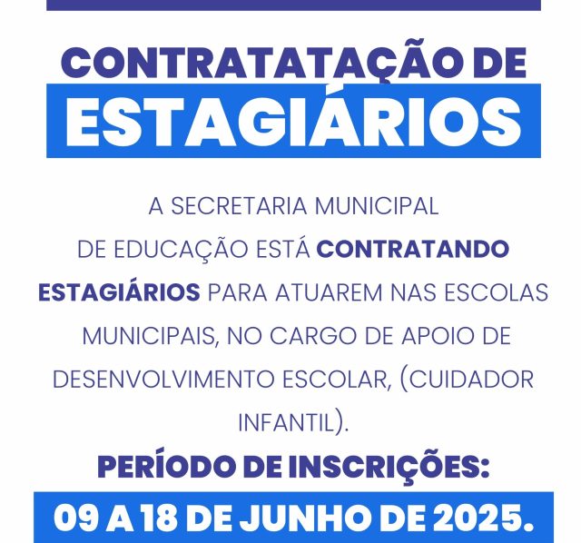 A Prefeitura de Colíder, por meio da Secretaria Municipal de Educação, anuncia a abertura do período de inscrições para contratação de estagiários que atuarão nas escolas da rede municipal no cargo de Apoio de Desenvolvimento Escolar (Cuidador Infantil). A ação é voltada a estudantes de cursos superiores e tem como objetivo reforçar a equipe escolar, ao mesmo tempo em que incentiva a realização de estágios dentro do próprio município.
