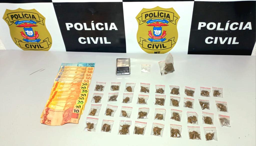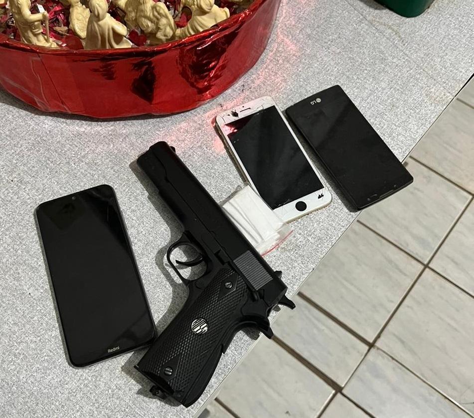 Durante as buscas, os policiais apreenderam 14 porções de pasta base de cocaína, uma porção de maconha além de uma balança de precisão e uma máquina de cartão, caracterizando o tráfico de drogas. Também foram apreendidos, um simulacro de arma de fogo e diversos celulares.