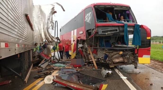 O ônibus teve a parte frontal destruída e foi parcialmente arrancada com o violento impacto. O caminhão teve parte do baú bastante danificado. Os dois veículos ficaram na pista.