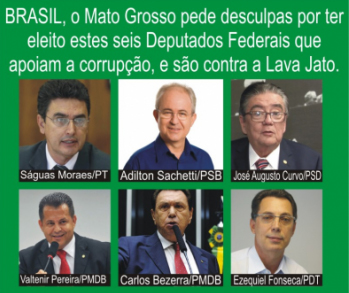 No panfleto estão os nomes de Ságuas Moraes (PT), Adilton Sachetti (PSB), José Augusto Curvo ‘Tampinha’ (PSD), Valtenir Pereira (PMDB), Carlos Bezerra (PMDB) e Ezequiel Fonseca (PP). Depois de mais de sete horas de sessão na Câmara dos Deputados, parlamentares desfiguraram o pacote que reúne um conjunto de medidas de combate à corrupção propostas pelo Ministério Público Federal e avalizadas por mais de 2 milhões de assinaturas de cidadãos encaminhadas ao Congresso Nacional.como “apoiadores da corrupçãoâ€. Nele, está o seguinte texto: “Brasil, o Mato Grosso pede desculpas por ter eleito estes seis deputados federais que apoiam a corrupção e são contra a Lava Jatoâ€.
