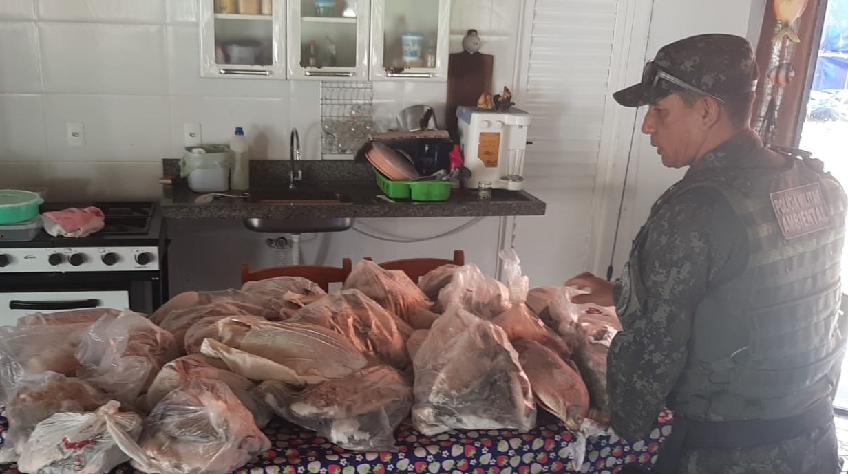 Entre as espécies encontradas estavam exemplares de Pacu Prata, Piavuçu e Piau Três Pintas. Além do pescado, foram apreendidas duas carabinas irregulares, munições intactas e cartucheiras. O responsável pela chácara recebeu multa de R $6.350,00 pela infração.