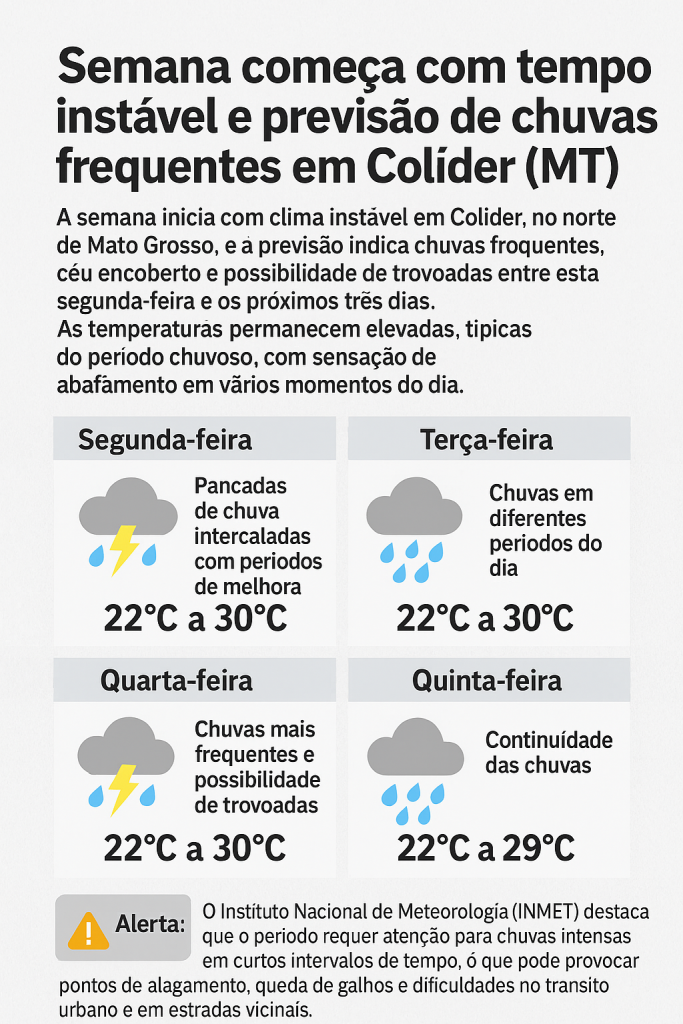 A semana inicia com clima instável em Colíder, no norte de Mato Grosso, e a previsão indica chuvas frequentes, céu encoberto e possibilidade de trovoadas entre esta segunda-feira e os próximos três dias. As temperaturas permanecem elevadas, típicas do período chuvoso, com sensação de abafamento em vários momentos do dia.