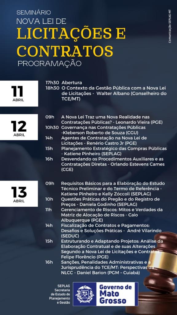 A Secretaria de Estado de Planejamento e Gestão (Seplag), por meio da Escola de Governo, está com inscrições abertas para o seminário sobre a “Nova Lei de Licitações e Contratos”. O evento será realizado entre os dias 11 e 13 de abril no auditório da Assembleia Legislativa, Milton Figueiredo.