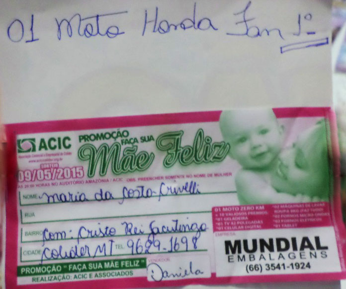 Além desses valiosos outros prêmios brindes cortesia  de empresas associadas, e que foram sorteados durante o evento à mães presentes. E a grande contemplada com a Moto Honda, o 1º lugar  foi Maria da Costa Crivelli.