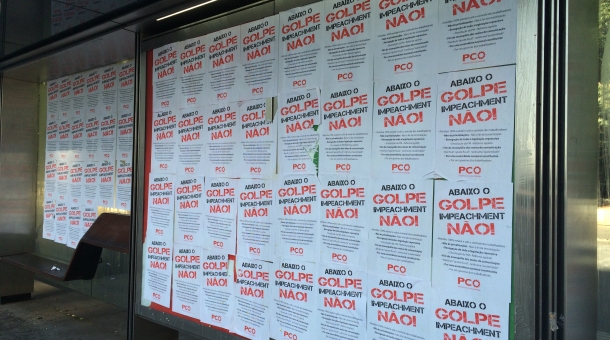 Propagandas assinadas pelo PCO trazem o recado ‘Abaixo o golpe, impeachment não!’ e foram afixadas durante a madrugada.
