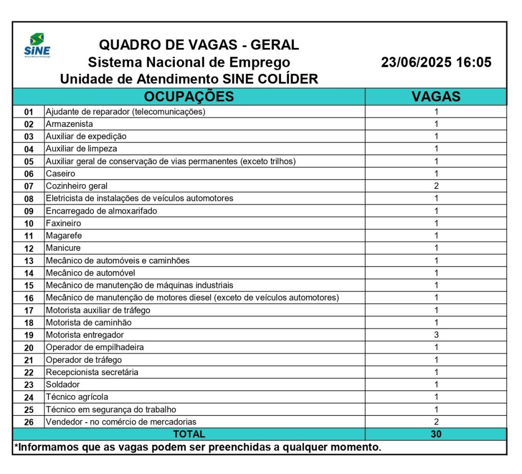 As oportunidades abrangem diversas áreas de atuação e estão distribuídas entre os 36 postos de atendimento do Sine, instalados em 32 municípios de Mato Grosso.