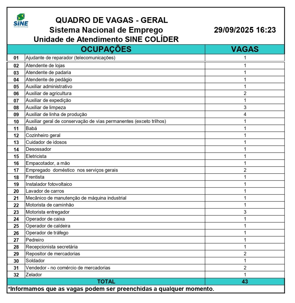 Em Sinop, são 348 vagas disponíveis, nas ocupações de pedreiro (26), operador de produção (22), auxiliar de linha de produção (21), coletor de lixo domiciliar (20), ajudante de obras (14), auxiliar de limpeza (12), repositor de mercadorias (12), soldador (12), carpinteiro (11), armador de ferragens na construção civil (10), pedreiro de edificações (10), operador de caixa (7), vendedor pracista (7), ajudante de eletricista (6), atendente de lojas (6), açougueiro (5), consultor de vendas (5), estoquista (5), instalador de sistemas eletroeletrônicos de segurança (5), montador de estruturas metálicas (5), servente de obras (5), atendente de mesa (4), atendente de pedágio (4), auxiliar de cozinha (4), auxiliar técnico de refrigeração (4), operador de retro-escavadeira (4), vendedor interno (4), vistoriador veicular (4) e outras.