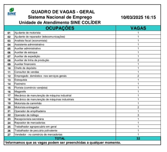 Em Cuiabá e Várzea Grande, são 339 empregos disponíveis em funções como auxiliar de linha de produção (45), ajudante de obras (28), pintor de obras (18), auxiliar de limpeza (14), motorista de caminhão (13), ajudante de carga e descarga de mercadoria (10), operador de caixa (9), motorista de ônibus urbano (8), promotor de vendas (7), repositor de mercadorias (7), dentre outras.