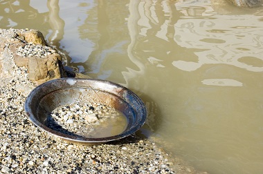 A prospector's pan left by the river. This is the pan that is used to search for alluvial gold in the stones of the river.