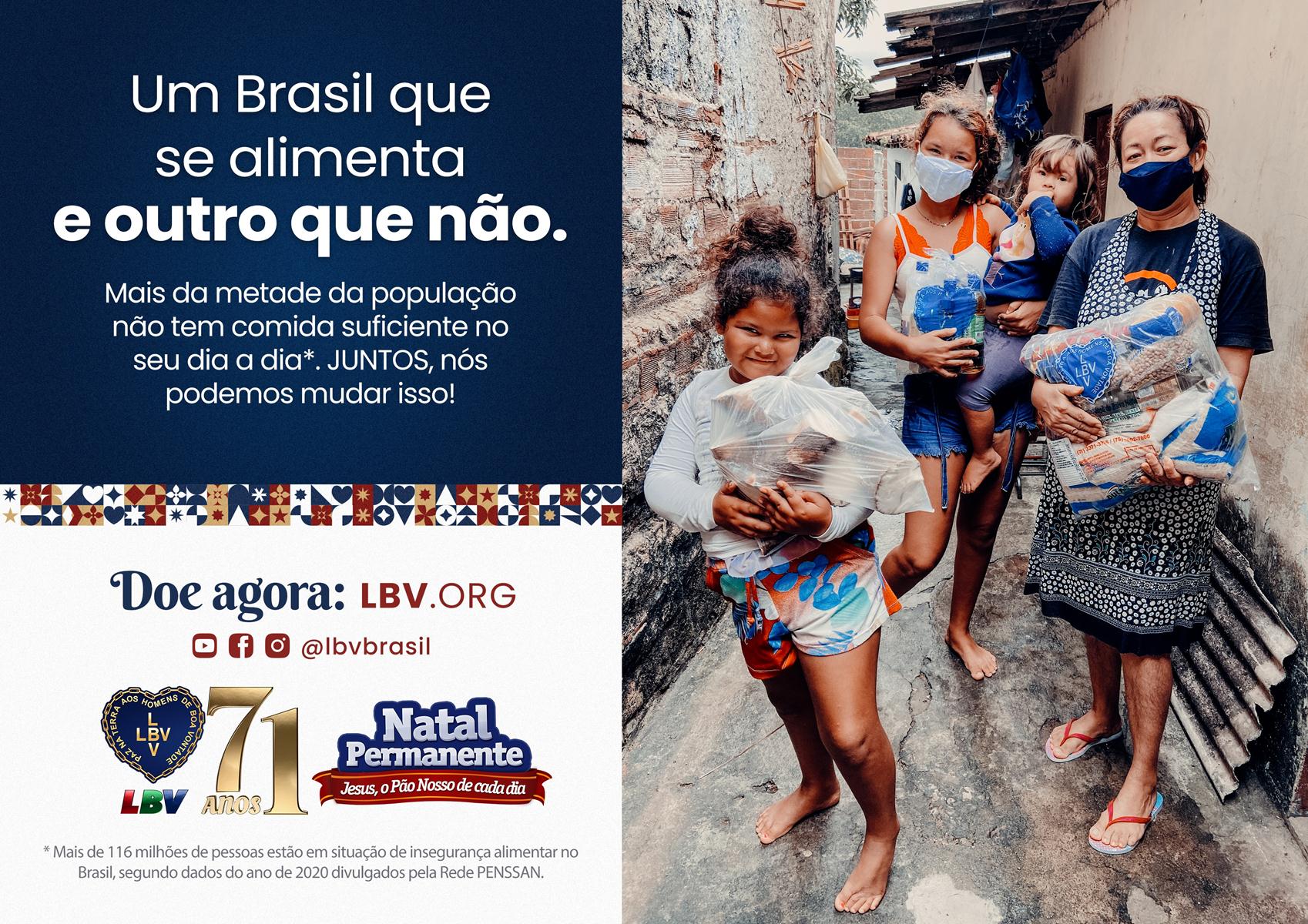 Por isso, a Legião da Boa Vontade (LBV) tem intensificado suas ações emergenciais para atender as famílias mais vulneráveis. No mês de dezembro, a Instituição promove sua tradicional campanha Natal Permanente da LBV — Jesus, o Pão Nosso de cada dia!, para fortalecer o espírito de Solidariedade e angariar doações em prol de quem mais precisa, assegurando-lhes o direito à alimentação.