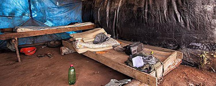 trabalho-escravo2_0 (1)       Os alojamentos onde os trabalhadores dormiam, no meio do mato, estavam em condições precárias. Eram construídos de forma improvisada, com camas feitas por tijolos ou madeiras, e com um único banheiro sem porta, que não oferecia nenhuma privacidade. A falta de água era constante, o que os obrigavam a tomar banho e lavar suas roupas no córrego que também era utilizado pelo gado da fazenda.