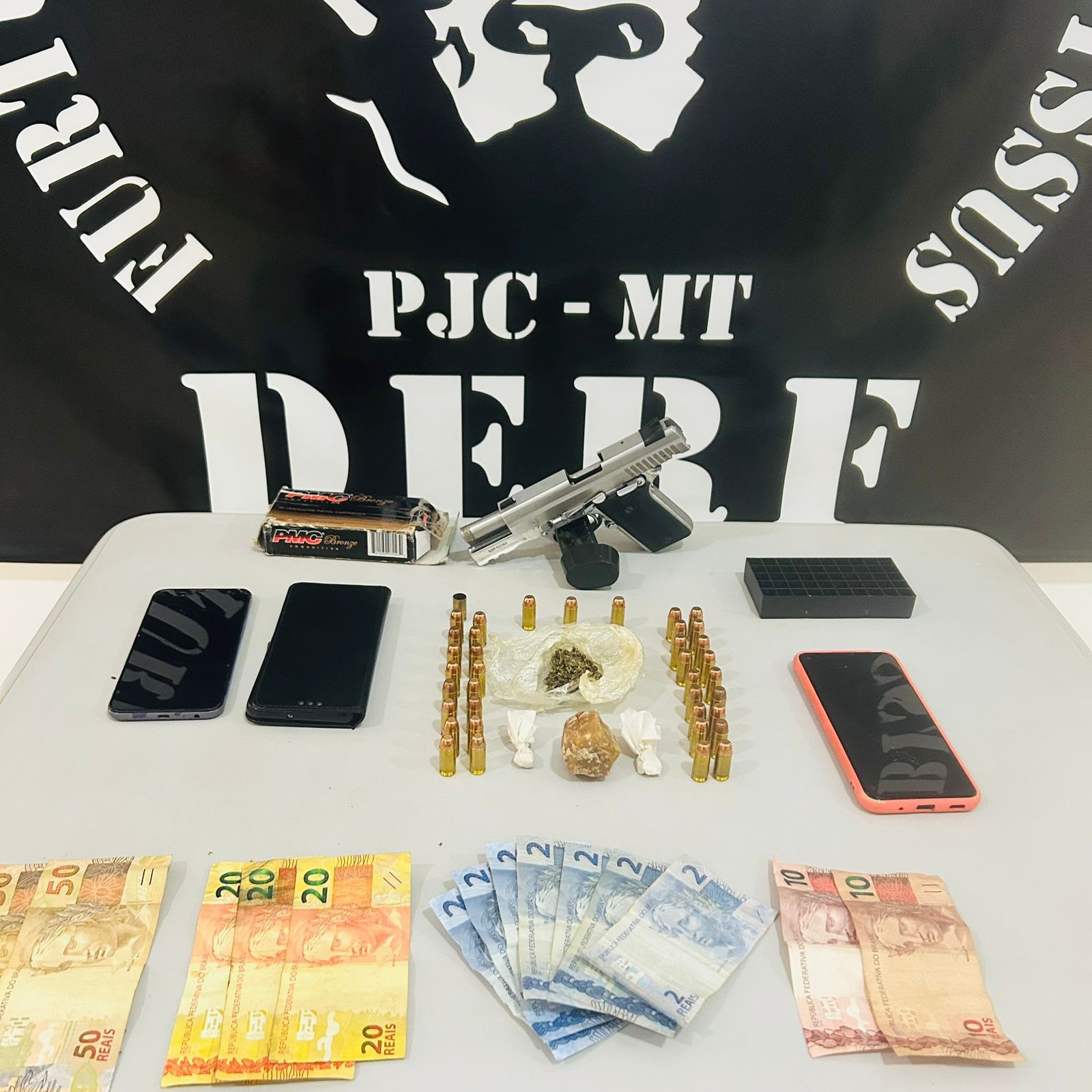 No quarto do suspeito, foi apreendida uma porção de maconha e uma arma de fogo tipo de escola com um carregador com 12 munições. Diante dos fatos, o suspeito foi conduzido à Derf de Nova Mutum, onde após ser interrogado, foi autuado em flagrante pelo crime de tráfico de drogas e porte ilegal de arma de fogo.