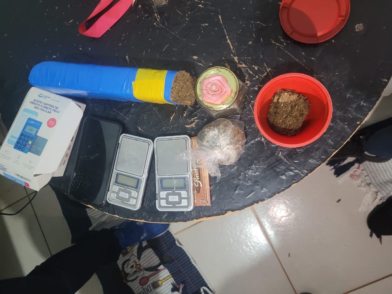 Os policiais realizaram a abordagem do suspeito, que questionado confessou que havia mais drogas em sua residência. Em buscas no quarto do suspeito, os policiais encontraram mais uma barra de maconha, além de balança de precisão, dois potes com porções de drogas já embaladas para venda, confirmando as suspeitas da atuação do traficante com a distribuição de drogas no município.