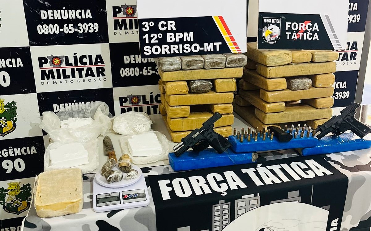 Policiais militares da Força Tática do 12º Batalhão apreenderam, neste domingo (30.04), 35 tabletes de maconha, quatro de cocaína, um de pasta base, duas pistolas e 27 munições, no bairro Nova Aliança, em Sorriso.