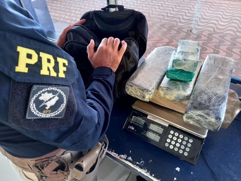 Diante da suspeita de estar levando algum objeto ilícito foi verificado os pertences pessoais do passageiro. Dentro da mochila dele foi encontrado seis tabletes de substância análoga à maconha.