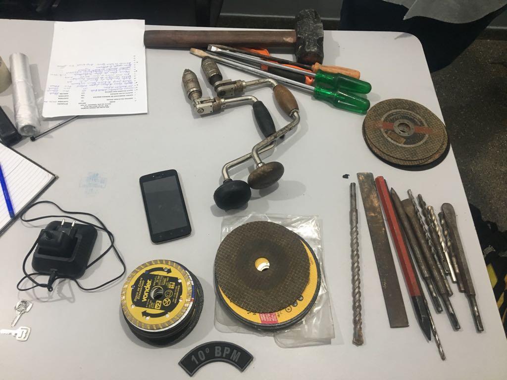 O barulho vinha de um barracão aos fundos do Bando do Brasil, na Rua 24 de Outubro. Ao entrar no barracão foi constatado um buraco na parede que dá acesso a agência e três mochilas com 13 discos de corte grande, 35 discos de corte pequenos, três chaves de fenda, duas puas, uma cegueta pequena, dois pontilhões, três talhadeiras, cinco brocas de diversos tamanhos, uma marreta e um carregador de rádio frequência HT e duas chaves de residência.