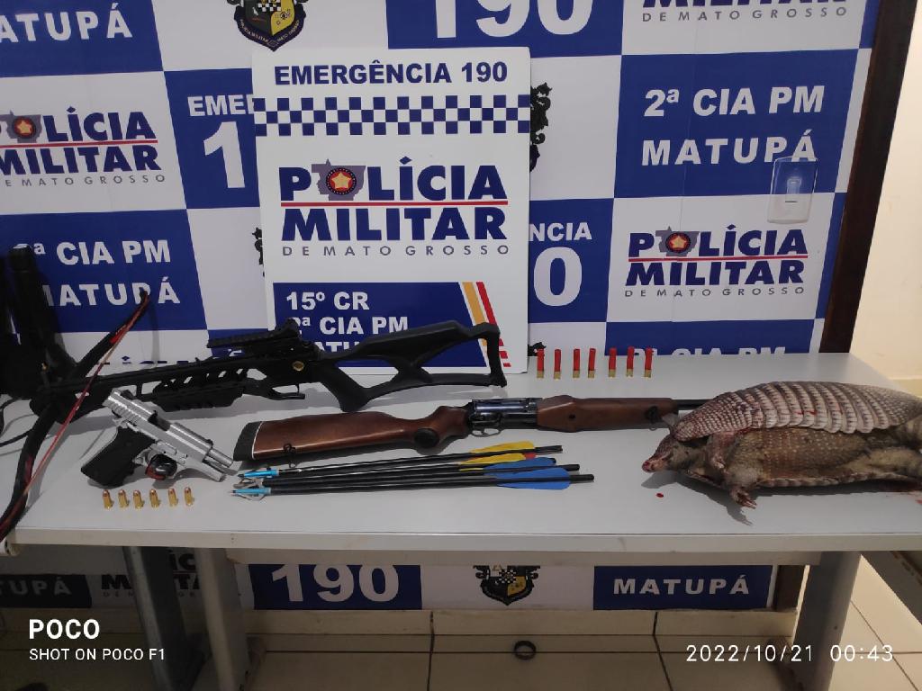 Três homens foram presos na noite desta quinta-feira (20.10) por porte ilegal de arma de fogo, crime ambiental e caça irregular, por policiais militares do 22º Batalhão em Matupá (684 km de Cuiabá). Durante ação, foram apreendidas duas armas de fogo e uma balestra com um arco de flechas adaptado. Ainda, um tatu abatido.