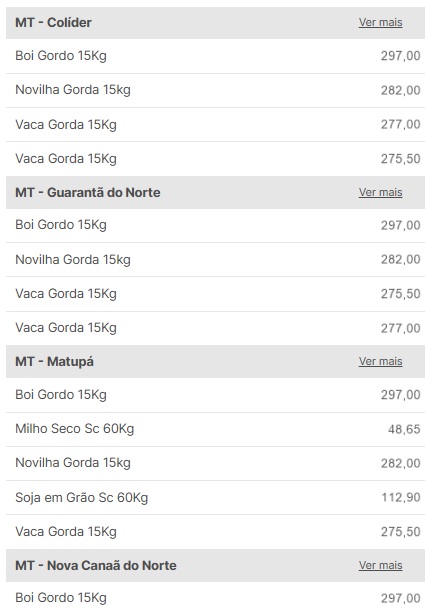 | Boi Gordo | Matupá (IMEA) | ~R$ 293,00/@ |
