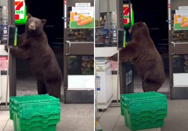 O urso entrou na loja de conveniência e passou álcool em gel - Foto: Reprodução/Vídeo          O vídeo de um urso passando álcool em gel ao invadir uma loja de conveniência está fazendo sucesso nas redes sociais! A cena inusitada aconteceu esta semana na Califórnia, Estados Unidos.