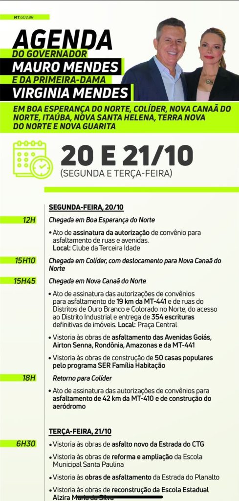 Início Colider Em Evidência Veja Agenda do Governador Mauro Mendes e Primeira-Dama Virginia em Colider Na... Colider Em Evidência Veja Agenda do Governador Mauro Mendes e Primeira-Dama Virginia em Colider Na Segunda-Feira(20) e Terça-Feira(21) Por Folha de Colíder - 18 de outubro de 2025 309 0 FacebookTwitterPinterestWhatsApp