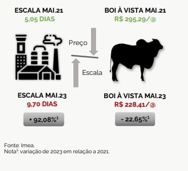 Nesse sentido, salienta o instituto, mediante a maior desvalorização dos bezerros frente ao boi gordo, a relação de troca entre essas categorias avançou 8,98% em maio de 2023 com relação ao mesmo período de 2021.