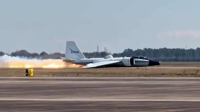 Avião de pesquisa da NASA pousa sem trem de pouso no Texas, gera chamas na pista e mobiliza equipes de emergência. Tripulação saiu ilesa
