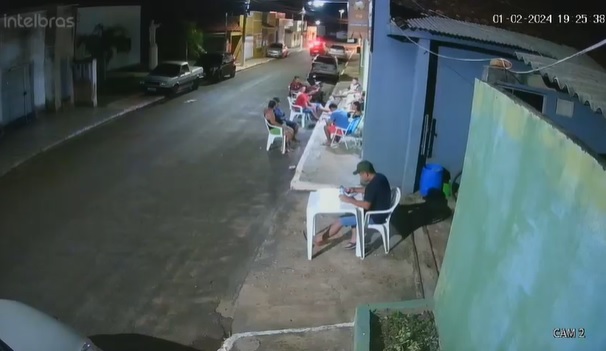 Imagens de uma câmera de segurança registraram a ação dos criminosos, que chegaram em uma motocicleta vermelha e, do meio da rua, já começam atirar na vítima.