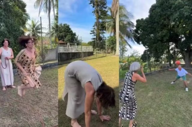 A tia Janete, de 74 anos, faz embaixadinha, pula corda e ensaia exercício de calistenia no chão.  Aí ela se junta ao tio Gilsinho, de 77 anos, para brincar com a bola dando cabeçadas. A tia Sueli, de 72 anos, rebola no bambolê e tem tanta elasticidade que consegue por as palmas da mão no chão com as pernas esticadas.