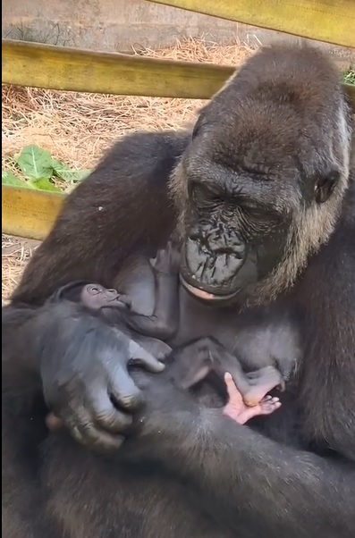 As cenas de carinho da mamãe gorila dando de mamar para seu novo bebê já foram vistas por mais de 28 milhões de pessoas no mundo. – Foto: @tratador_chad/Instagram
