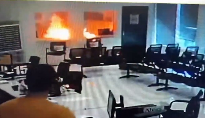 As imagens também mostram as pessoas que aguardavam atendimento saindo assustadas no momento em que se inicia o incêndio.