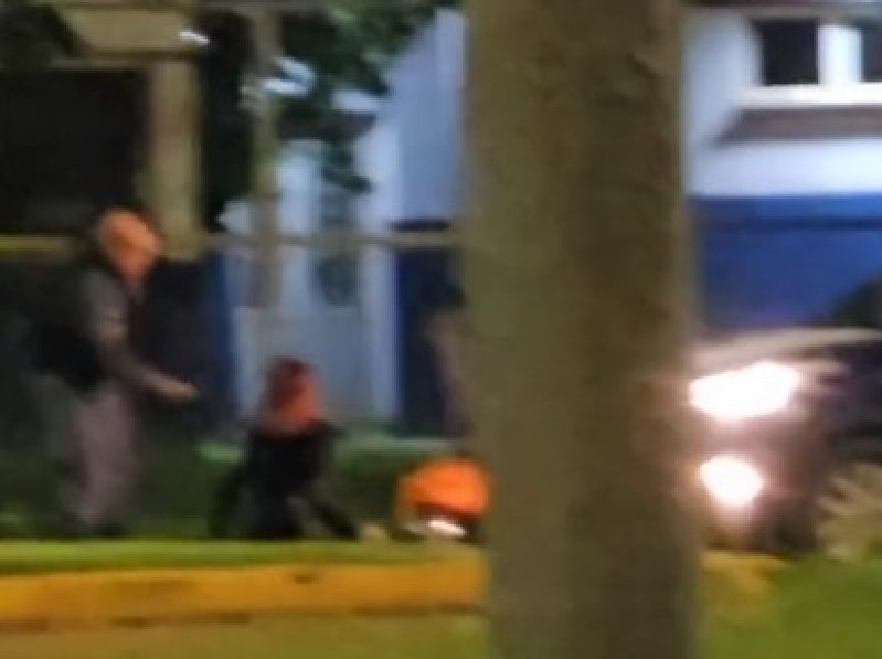 Nas imagens, é possível ver a mulher sentada no chão, apanhando enquanto um homem está deitado. O casal estaria em uma motocicleta quando foi abordado.